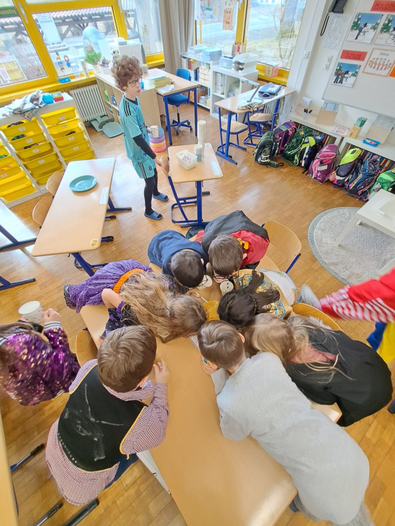 Nach der Begrüßung durch Frau Mayer sangen wir gemeinsam das Lied "Kleiner grüner Kranz". Unterstützt wurden wir dabei von Flötenkindern aus der 3. und 4. Klasse. Im Anschluss lass unsere Schulleiterin den 1. Teil der Geschichte vor und zeigte uns die Bilder dazu.